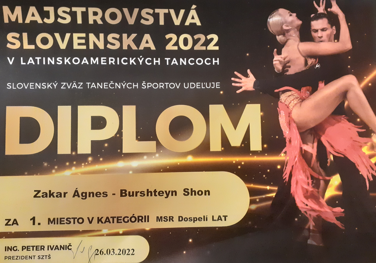 2022. március 26-án Poprádon zajlott a latin-amerikai táncok Szlovák Bajnoksága. Zakar Ágnes (a Közgazdaságtan és vállalati menedzsment mesterképzés elsőéves hallgatója) és táncpartnere, Shone Burshteyn a tavalyi bajnoki címet megvédve az idén ismét a legjobbnak bizonyultak. A latin-amerikai táncok mindegyikében (samba, cha-cha, rumba, paso doble és jive) fölényesen nyertek, így immár másodízben szereztek országos bajnoki címet a latin-amerikai versenytáncok felnőtt kategóriájában Szlovákiában. Ágnes és táncpartnere Olaszországban készülnek a megmérettetésekre, rangos nemzetközi versenyeken, EB-n és VB-n képviselik Szlovákiát és a Selye János Egyetemet.