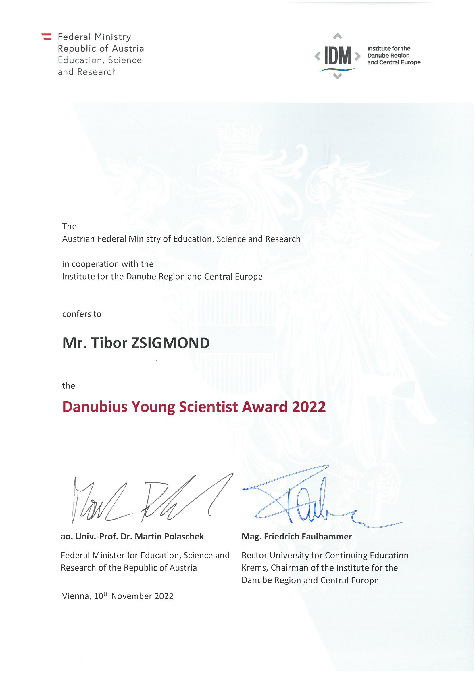 Az Osztrák Oktatási, Tudományos és Kutatási Minisztérium (Austrian Federal Ministry for Education, Science and Research), valamint a Duna Régió és Közép-Európa Intézet (Institute for Danube Region and Central Europe) által közösen meghirdetett “Danubius Young Scientist Award 2022” elnevezésű díját a Gazdaságtudományi és Informatikai Kar Menedzsment Tanszékének adjunktusa, Mgr. Zsigmond Tibor, PhD. nyerte el Szlovákiából.