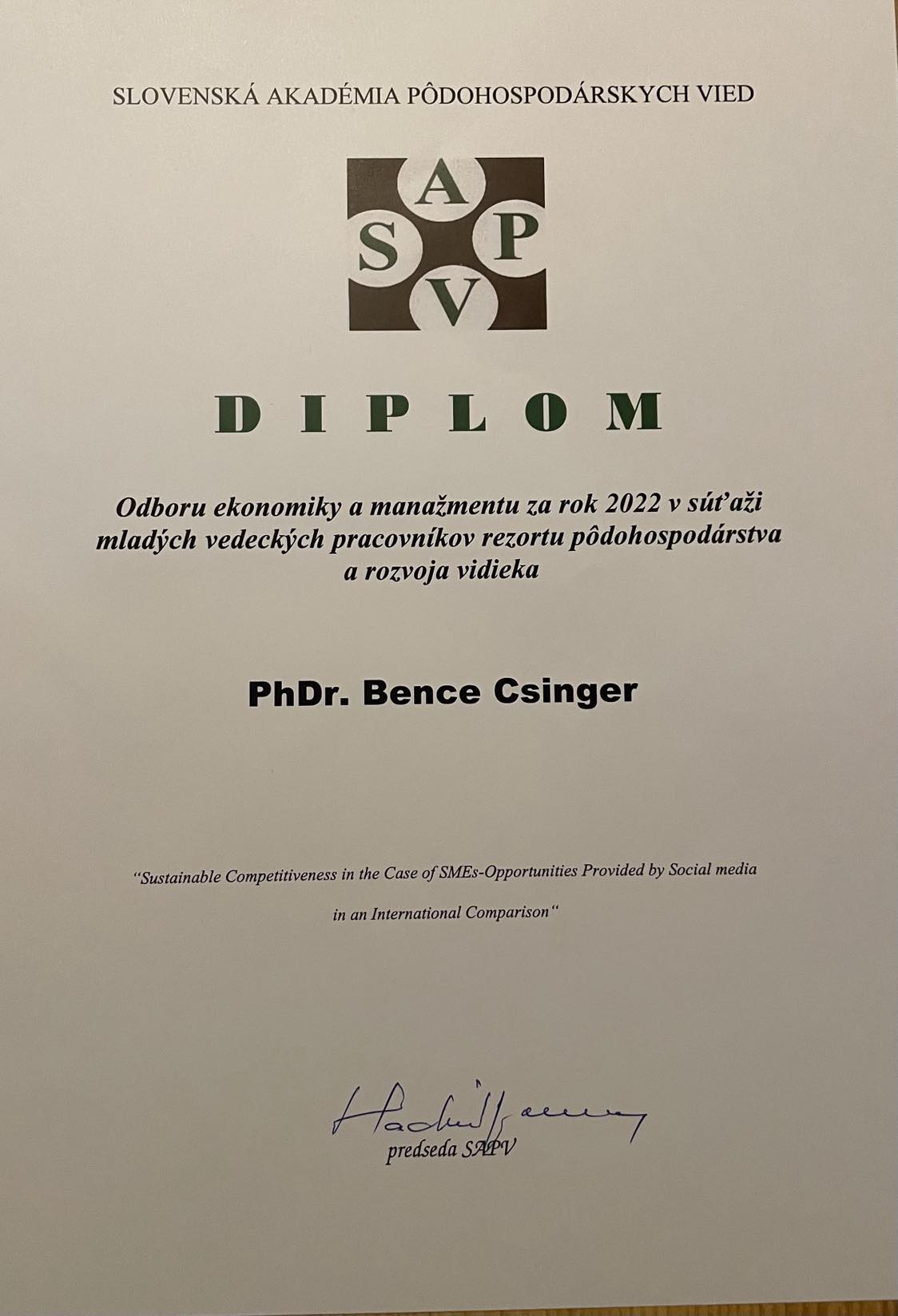 A Szlovák Agrártudományi Akadémia idén is meghirdette „Fiatal tudományos munkatárs“ versenyét, melyre olyan tudományos munkákkal lehetett pályázni, melyek jelentős gyakorlati alkalmazhatósággal jellemezhetők. A Szlovák Agrártudományi Akadémia Közgazdasági és Menedzsment Tagozata elnökének díját PhDr. Csinger Bence nyerte el „Sustainable Competitiveness in the Case of SMEs – Opportunities Provided by Social Media in an International Comparison“ kimenetelével.