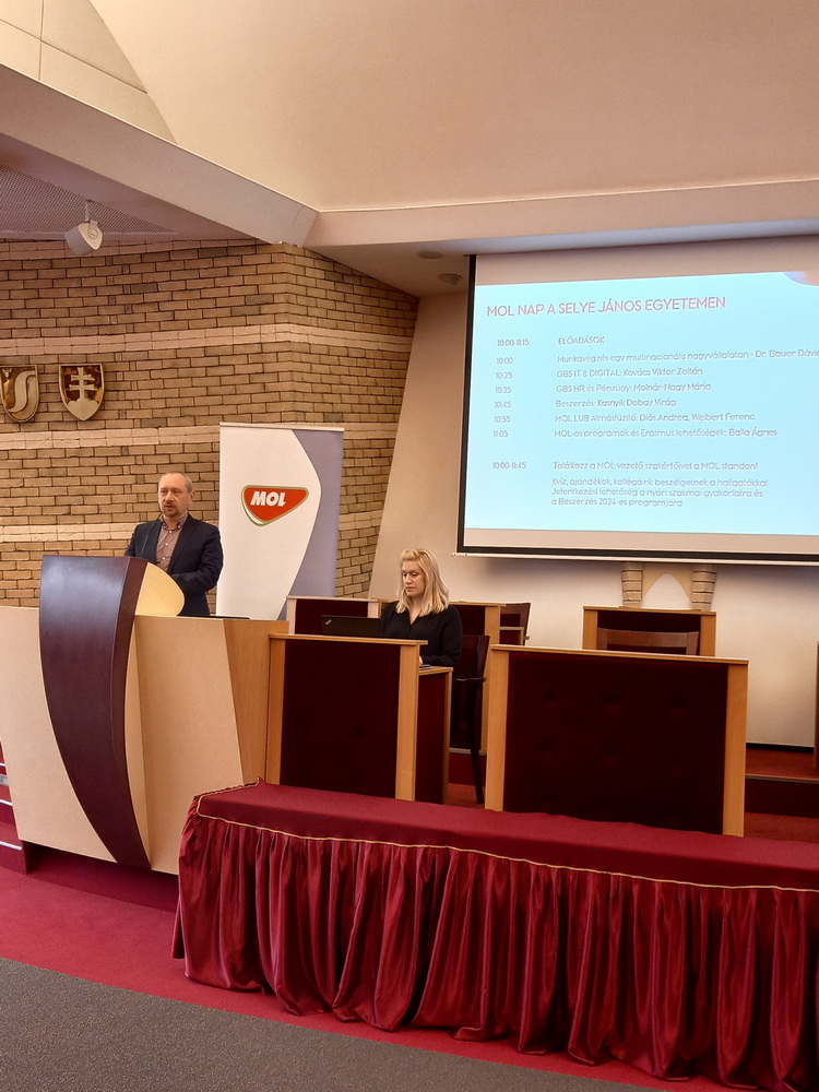 Hagyományteremtő jelleggel, s idén már 3. alkalommal került megrendezésre jelentős érdeklődő hallgatósággal 2024. február 22-én a SJE-MOL EGYETEMI NAP a Selye János Egyetem Konferencia-központjában. A rendezvény keretein belül a MOL csoport, mint a kar egyik kiemelt stratégiai partnere ismertette a Gazdaságtudományi és Informatikai Kar hallgatóival nyári szakmai gyakorlatának lehetőségét, ill. annak feltételeit. A rendezvényen Dr.habil. RNDr. Csiba Peter, PhD. a Gazdaságtudományi és Informatikai Kar dékánjának köszöntője után nyitó előadóként Dr. Bauer Dávid a MOL csoport HR igazgatója tartotta meg előadását a vállalatról, s annak vállalati stratégiáját kiemelve hangsúlyozta, hogy többek között nagy figyelmet fordítanak a tehetséges fiatalok felkarolására, a karrierépítésre azáltal, hogy a szakmai gyakorlatok lehetőségét felkínálva folyamatosan lehetőséget biztosítsanak egyetemista hallgatók számára közelebbről megismerni a MOL csoportot és annak munkamódszereit, s így akár leendő munkáltatójukat.