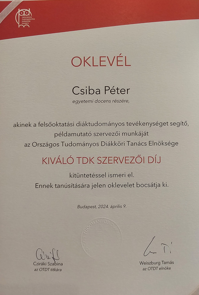 Az Országos Tudományos Diákköri Tanács (OTDT) 2024. április 9-i ülésén, a szervezet Elnöksége a 36. Országos Tudámonyos Diákköri Konferencia (OTDK) Közgazdaságtudományi Szekciója során végzett kimagasló színvonalú szervezői munkája alapján, Kiváló TDK Szervezői Díj elismerésben részesítette Dr. habil. RNDr. Csiba Peter, PhD., a Selye János Egyetem Gazdaságtudományi és Informatikai Karának dékánját és PHDr. Antalík Imrich, PhD., és a kar Tudományos tevékenység dékánhelyettesét, aki mindemellett kinevezését is átvette az OTDT Közgazdaságtudományi Szakmai Bizottságának alelnöki tisztségére. A csapatmunka jegyében a kar képviselői szervezőtársaiknak ajánlva, a 36. OTDK Közgazdaságtudományi szekció egész kivitelező csapatának nevében vették át díjaikat.