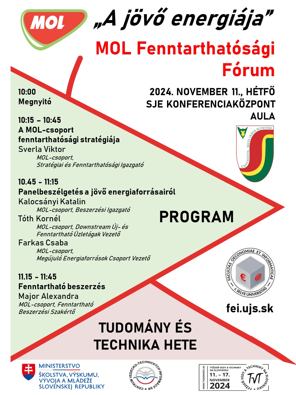 2024. november 11-én, 10:00-kor kerül sor a Selye János Egyetem Konferenciaközpontjának aulájában a „A jövő energiája” címmel  a MOL-csopporttal együttműködésben szervezett Fenntarhatósági Fórumra. A rendezvényre minden érdeklődőt sok szeretettel várunk!