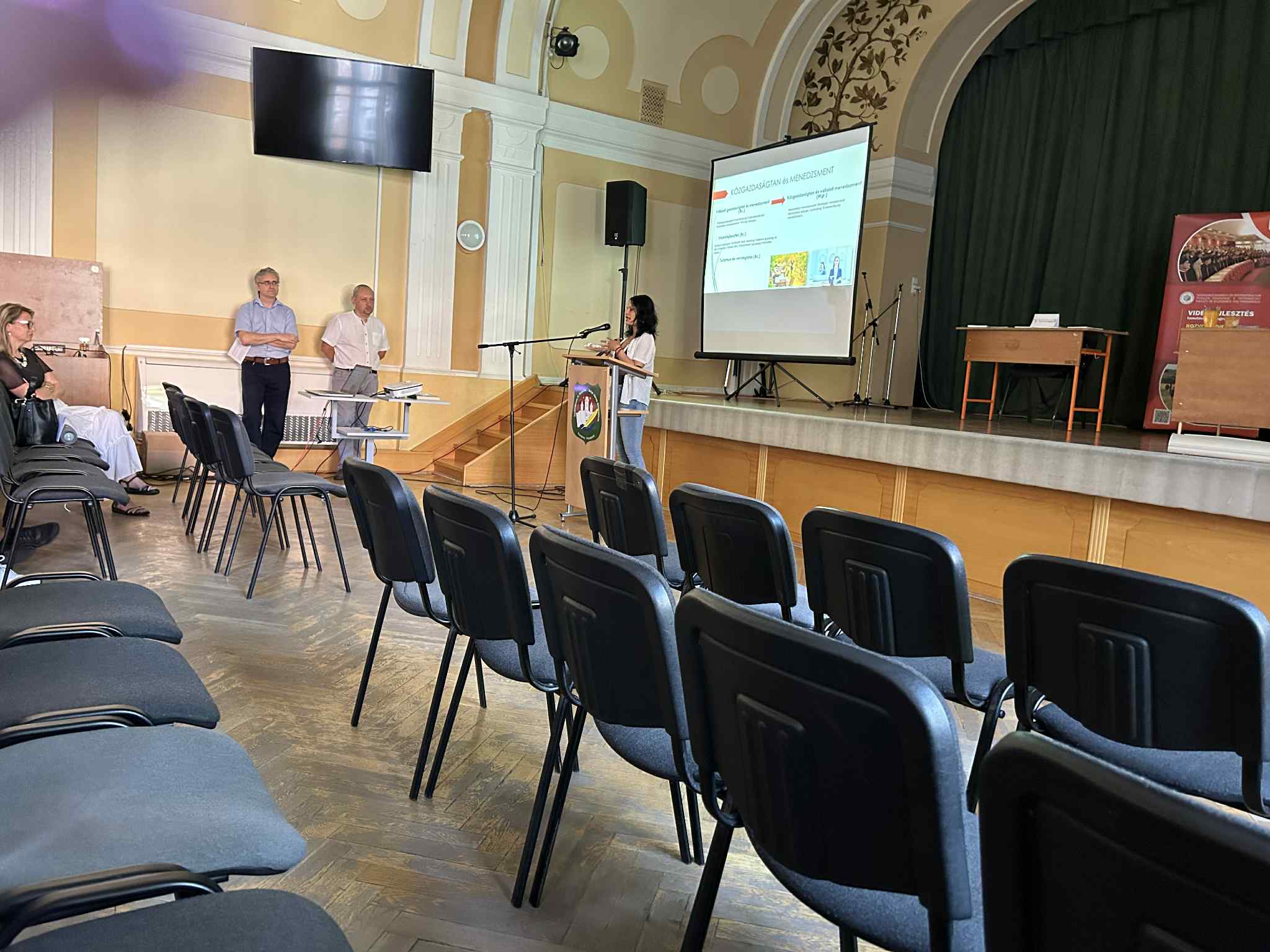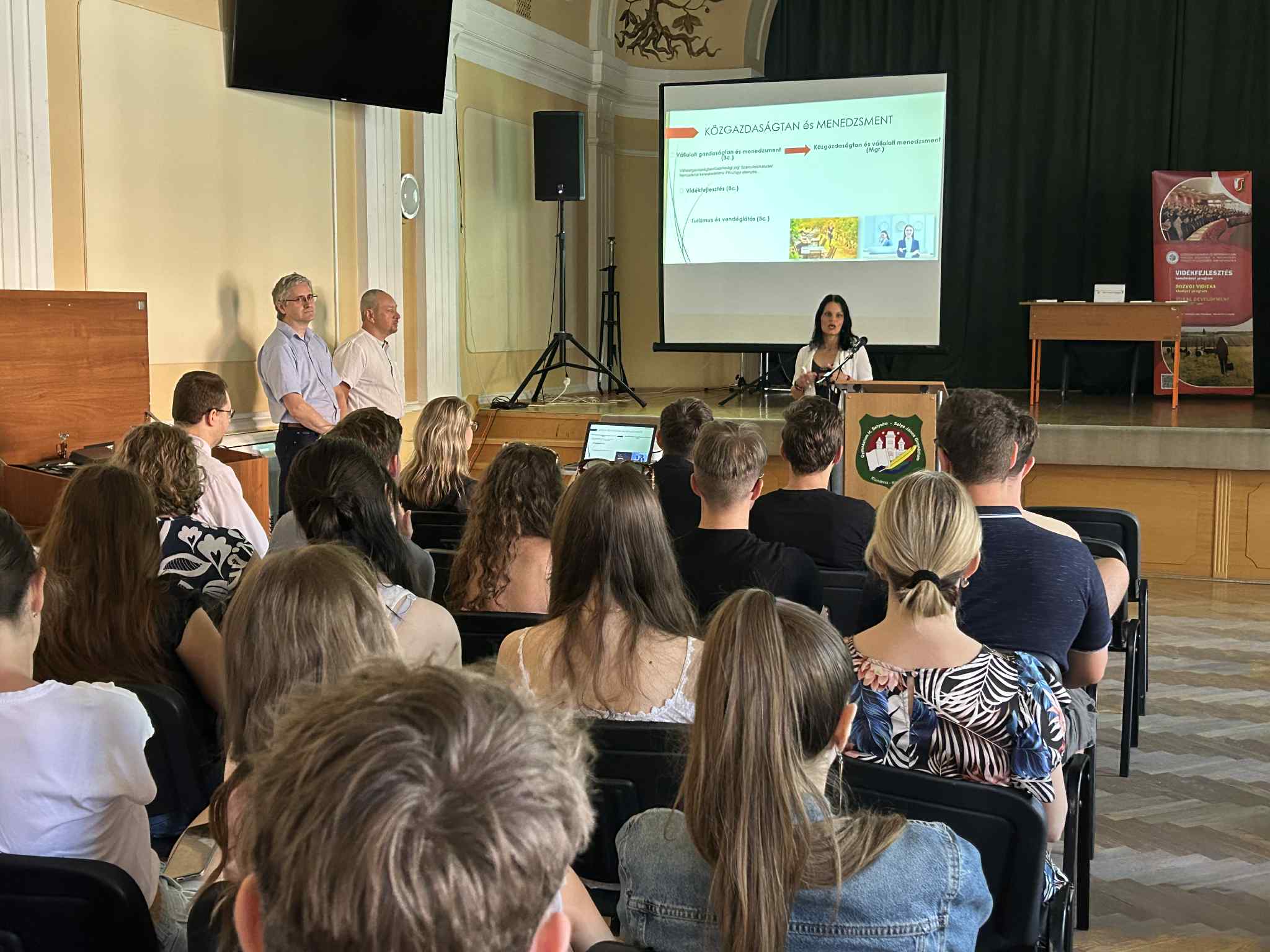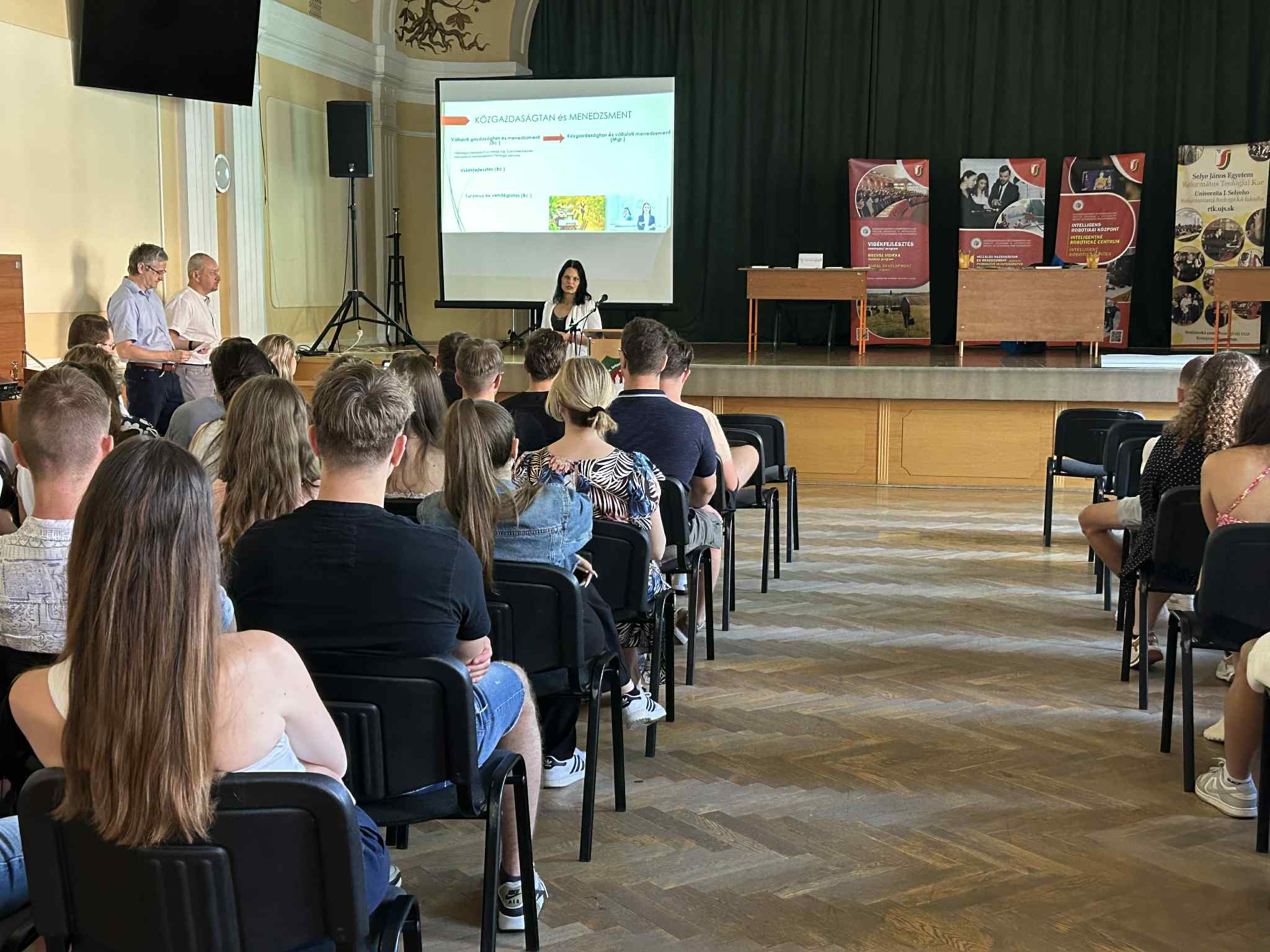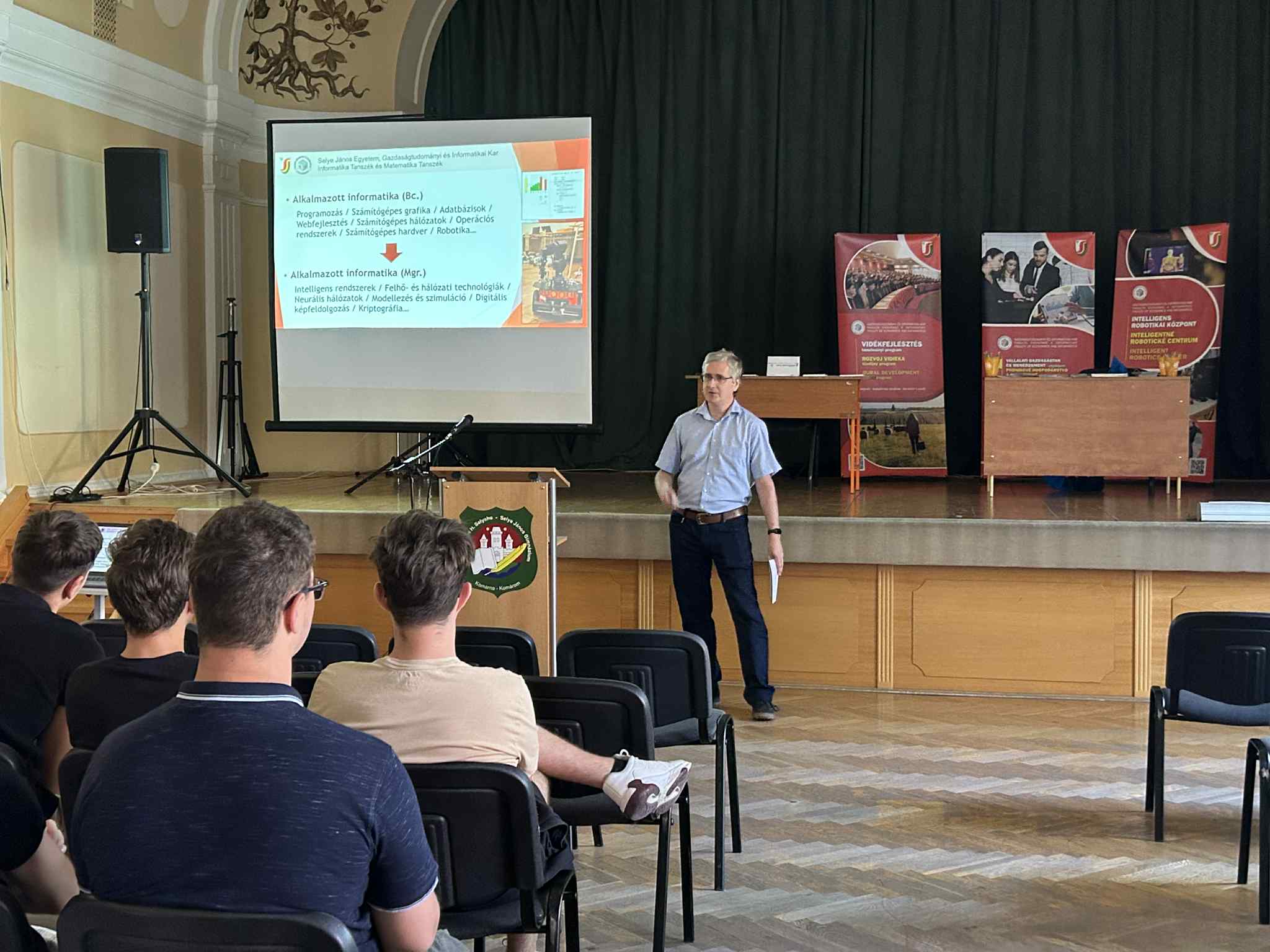 A Selye János Gimnázium által 2025. június 20-án szervezett egyetemi börzéjén a továbbtanulási lehetőségek iránt érdeklődő diákok megismerhették karunk tanulmányi programjainak kínálatát. Karunkat a rendezvényen Dr. habil. RNDr. Csiba Peter, PhD. a Gazdaságtudományi és Informatikai Kar dékánja, PhDr. Szeiner Zsuzsanna, PhD., a Közgazdaságtan és Menedzsment Tanszék vezetője, valamint PaedDr. Végh Ladislav, PhD., az Alkalmazott informatika, alapszintű, gyakorlatorientált tanulmányi programért felelős személy, az Informatika Tanszék docense képviselte.