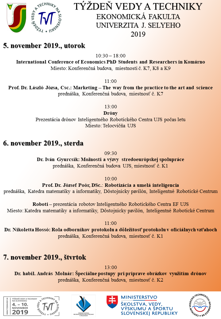 Ekonomická fakulta Univerzity J. Selyeho sa každoročne zapája svojimi sprievodnými podujatiami do Týždňa vedy a techniky. Tohtoročné sprievodné podujatia na EF Univerzite J. Selyeho sú nasledovné: