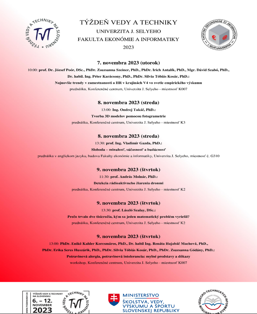 Fakulta ekonómie a informatiky Univerzity J. Selyeho sa každoročne zapája svojimi sprievodnými podujatiami do Týždňa vedy a techniky. Tohtoročné sprievodné podujatia na Fakulte ekonómie a informatiky Univerzity J. Selyeho